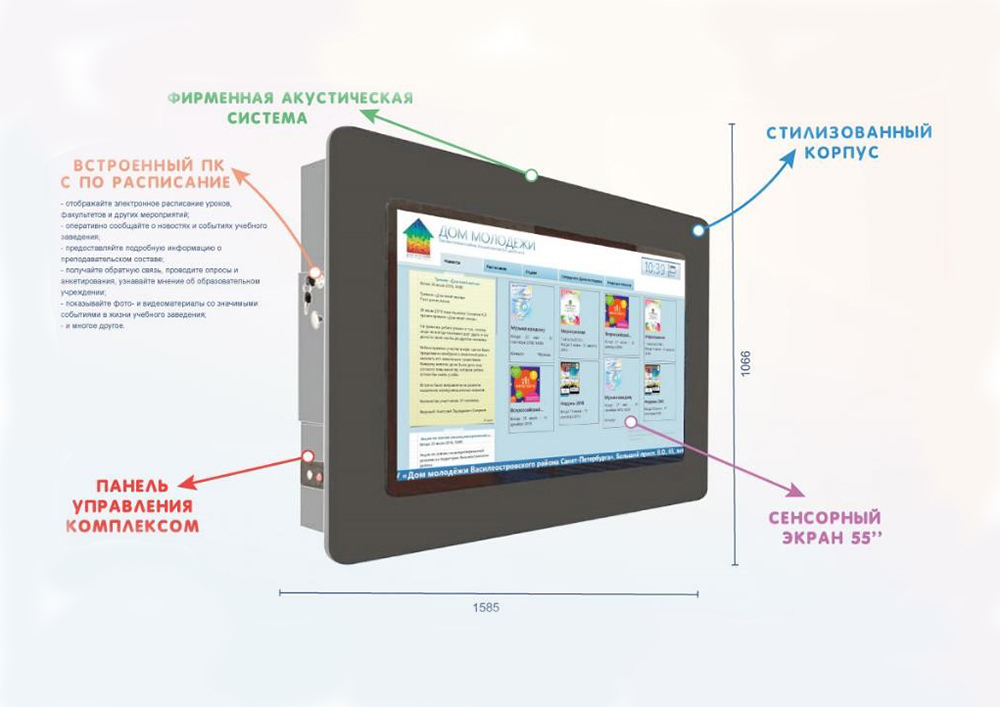 - на управляющем ПК находится предустановленное ПО «Расписание», которое заполняет методист, вносит правки, выкладывает новости и объявления;