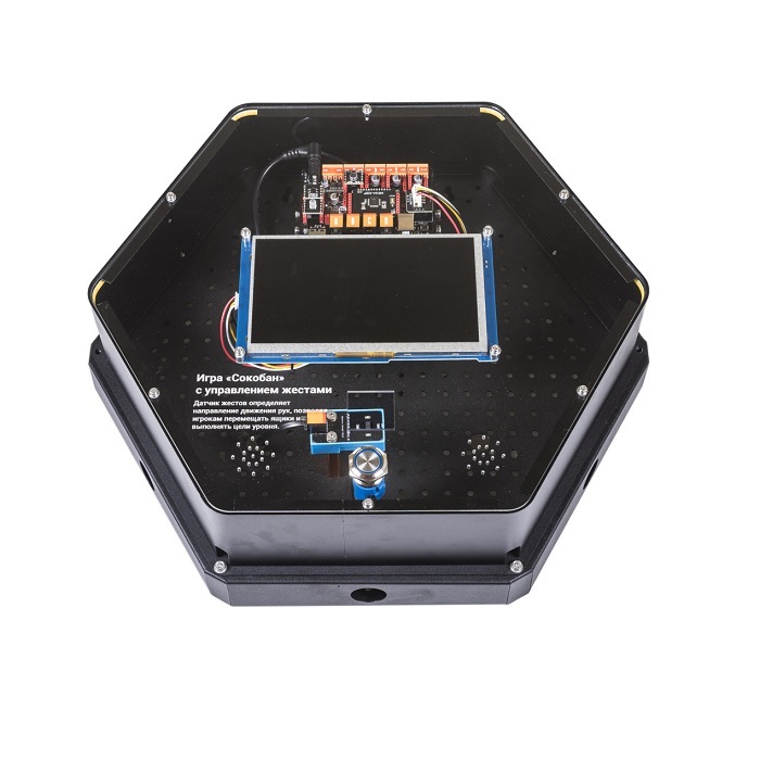 Интерактивный модуль для оформления зон рекреации, кабинетов, IT-полигона, библиотеки, медиа зоны. Модуль позволяет управлять игрой Sokoban с помощью жестов рук и демонстрирует принцип работы датчика жестов. Выполнен в форме шестиугольной призмы с интерактивным наполнением.
