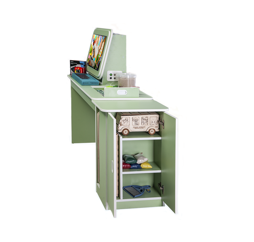 Интерактивный стол психолога содержит в себе весь необходимый функционал: сенсорный монитор, предустановленные пакеты школьных программ для психолога, наборы развивающих тренажеров, встроенную песочницу, удобный пульт управления.