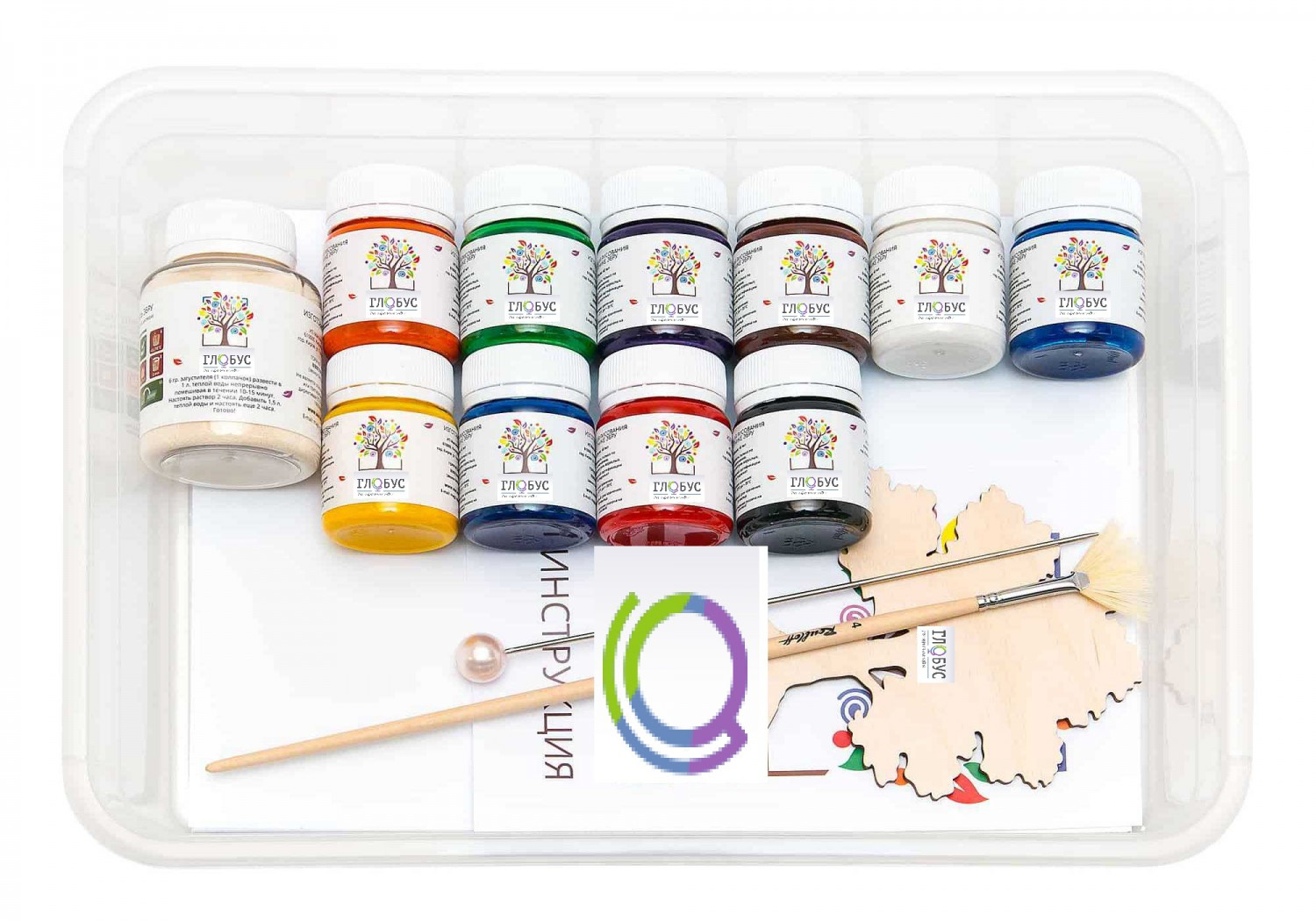 1) Краска 20мл. 10 цветов (белый, черный, красный, желтый, синий, зеленый, фиолетовый, оранжевый, коричневый, голубой);