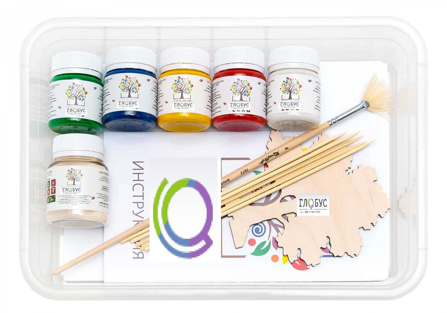 1) Краска 20мл. 5 цветов (белый, красный, желтый, синий, зеленый);