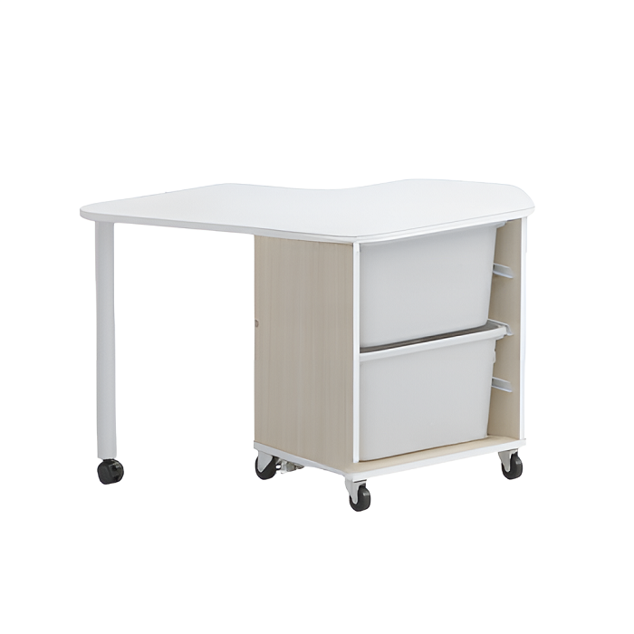 Стол детский левый Робик 002 выполнен из цветной ламинированной ДСП 16мм, кромки щитовых элементов облицованы кромочным пластиком толщиной 2 мм. Конструктивно стол выполнен в виде тумбы на колёсных опорах (две опоры с тормозом) и крышкой имеющей свес, поддерживаемый металлической опорой на колёсике. Внутри стола в открытой нише установлены два пластиковых лотка высотой по 230мм (длина лотка – 420 мм, ширина – 300 мм).