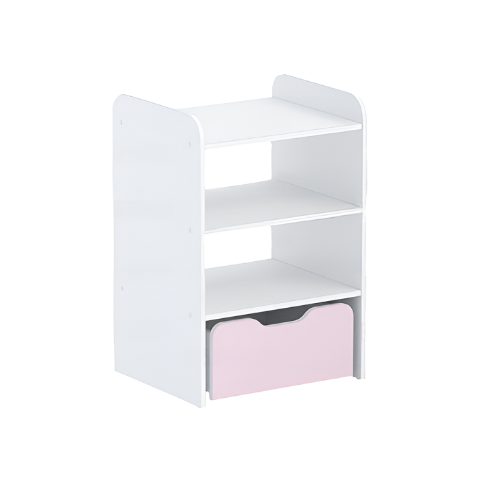 Стеллаж состоит из тумбы с жестко скрепленной полками и выдвижным ящиком.