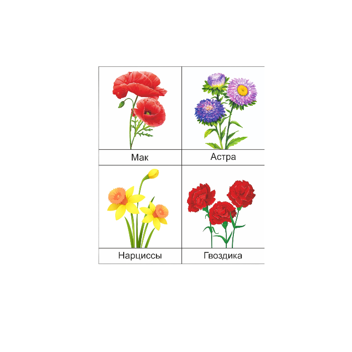 В наборе – Колокольчик, Мак, Астра, Василек, Нарцисс, Гвоздика, Тюльпан, Ирис, Роза, Ромашка, Подсолнух, Виола (Анютины глазки). Карточки можно разрезать. Данный набор подходит для работы с игровым полем. Для каждой карточки вложена липучка (лентой Velcro).