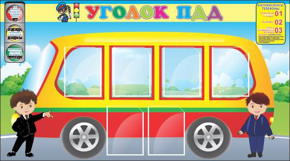 Стенд имеет яркий дизайн, поэтому сразу заинтересует малышей. Главным элементом дизайна выступает большой автобус желто-красного цвета. В верхнем углу слева дети найдут светофор. Стенд может выполнять не только информационную, но и дидактическую функции. Детей можно спросить о том, на какой свет можно переходить через дорогу, с какой стороны необходимо переходить через автобус. В информационных карманах можно поместить яркие тематические картинки, отражающие суть самого стенда.