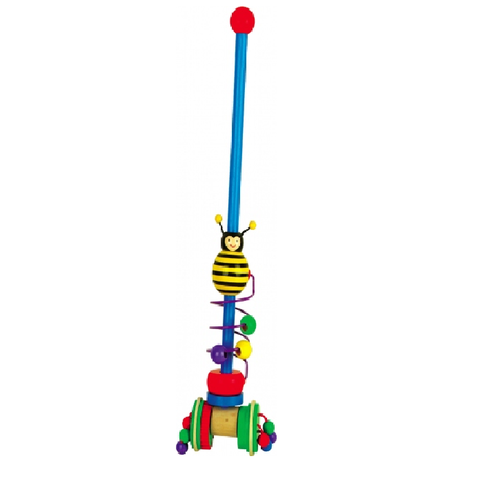 Деревянная игрушка-каталка на длинной ручке развлечет начинающего ходить малыша. На конце ручки – шарик, который удобно помещается в руке, в начале ручки симпатичная пчела и спираль с большими бусинами. Во время движения пчелка крутится вокруг своей оси. При катании игрушка тарахтит благодаря бусинам на колесах (по четыре штуки с каждой стороны). Игрушка стимулирует малыша к активным действиям и движению.