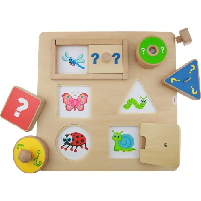 На лицевой части панели расположены шести элементов (окон) в разных геометрических формах, с различными механизмами открывания. Один из элементов содержит глазок с увеличивающей линзой. В процессе игры ребёнок угадывает, что там может быть: насекомое, транспорт, цвет, фигура и т.п., а далее может рассказать, что он знает об этом.