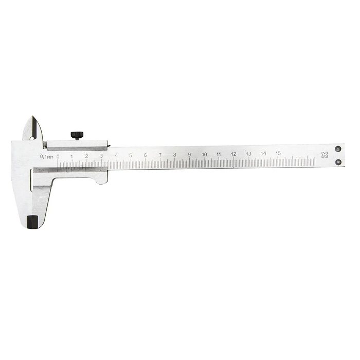 Металлический штангенциркуль - инструмент длиной в 150 мм для измерения деталей. Он исполнен из металла, насечки с шагом 0.1 мм. Инструмент имеет второй класс точности. Обладает прочностью и надежностью применения.