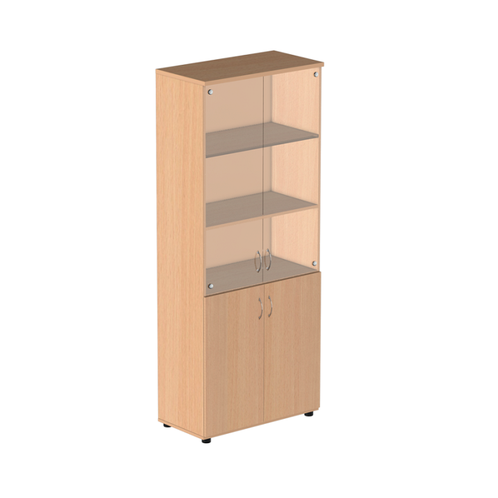 Шкаф высокий с нишей и прозрачным стеклом из ЛДСП толщиной 22 мм, выполненный в классическом стиле, имеет 5 отсеков для хранения документов, два нижних отсека закрываются глухими дверцами, две верхние полки - дверцами из прозрачного стекла, и открытую нишу между ними. Возможные цвета отделки: бук, венге/дуб, вишня, дуб кронберг, орех.