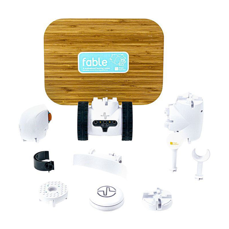Насадки позволяют добавлять в дизайн материалы, напечатанные на 3D-принтере, а также кубики LEGO. Программное обеспечение с двумя экранами позволяет студентам блочно программировать в Fable, одновременно изучая Python. Когда они будут готовы, они могут переключиться на текстовый язык и создавать еще более масштабные решения.