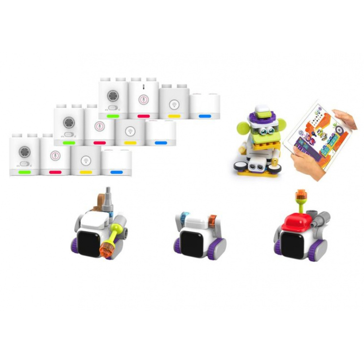 В составе комплекта также роботдля детей от 4 лет, программируемый в упрощенно визуальной среде, для знакомства детей с началами блочного программирования, знакомства с устройством робота, с основными его элементами (датчики, силовые модули, контроллер), развития творческих и инженерных навыков в игровой форме.В составе набора робота содержится программируемый блок управления с двигателями и модулями связи, датчик расстояния, сервоприводный блок и конструктивные элементы для постройки робота. Программирование осуществляется в визуальной среде на мобильном устройстве с использованием игровой дополненной реальности. Подключение по Bluetooth. Робот может двигаться, светиться, танцевать, и издавать звуки.